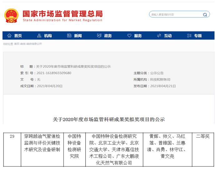日前,國家市場監(jiān)督管理總局公示了2020年度市場監(jiān)管科研成果獎項目,由中國特種設(shè)備檢測研究院牽頭,天津市嘉信技術(shù)工程公司等單位聯(lián)合完成的“穿跨越油氣管道檢監(jiān)測與評價關(guān)鍵技術(shù)研究及設(shè)備研制”項目榮獲2020年度國家市場監(jiān)管總局科研成果獎“二等獎”。根據(jù)《市場監(jiān)管科研成果獎管理辦法》等有關(guān)規(guī)定,已由評審委員會在市場監(jiān)管總局網(wǎng)站(http://www.samr.gov.cn/)和市場監(jiān)管科技管理信息系統(tǒng)(http://srp.pms.org.cn/)同時進行對外公示。