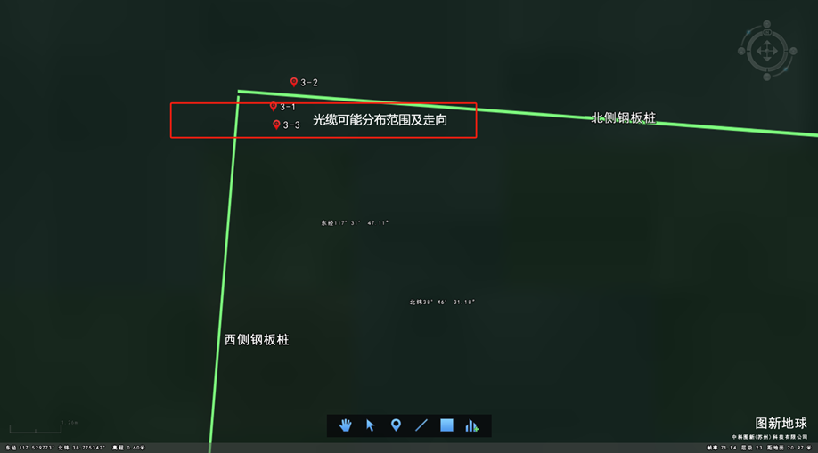 為明確未知管線走向,技術(shù)人員在北側(cè)鋼板樁和西側(cè)鋼板樁(均未施工)夾角處分別鉆設(shè)3個(gè)鉆孔進(jìn)行測量。結(jié)果顯示,3個(gè)孔測得信號(hào)頻率均與目標(biāo)管道施加信號(hào)頻率一致,1# 和3# 孔處均有較強(qiáng)的信號(hào)響應(yīng),且3# 孔信號(hào)為最強(qiáng)。未知管線位于1# 和3# 孔之間的40cm范圍內(nèi),且距3# 孔更近。結(jié)合2# 位置的測量數(shù)據(jù),進(jìn)一步分析得出光纜的走向與目標(biāo)管線一致,由此可以驗(yàn)證未知管線為伴行光纜。光纜應(yīng)位于北側(cè)鋼板樁未施工部分的南側(cè)區(qū)域,且與北側(cè)及西側(cè)未施工的鋼板樁施工路徑存在交叉點(diǎn)。