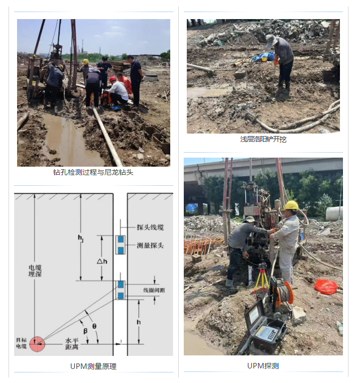 UPM系統(tǒng)采用嘉信技術(shù)的專利探井電磁檢查技術(shù)以及衛(wèi)星同步信號發(fā)射方法,將探頭通過打孔的方式送到距離管線較近的位置進(jìn)行探測,通過井中探頭接收給待測電纜施加的電磁信號,實(shí)現(xiàn)超深管線水平位置、走向以及埋深精確定位,克服了磁梯度法探測范圍小且易受干擾的難題。
