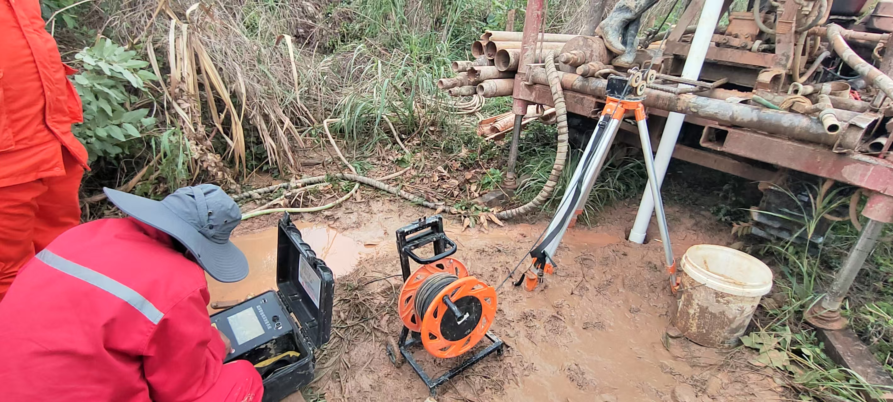 為確保光纜與管道安全,工作人員在初測的管道和光纜位置5米以外選取3個點(diǎn)位鉆孔,使用嘉信技術(shù)自主研發(fā)的超深管線精確探測系統(tǒng)UPM進(jìn)行探測。應(yīng)用井中電磁法,經(jīng)過現(xiàn)場反復(fù)驗證及數(shù)據(jù)校準(zhǔn),最終精準(zhǔn)確定管線位置及埋深。在河堤南側(cè),光纜埋深12.2米,燃?xì)夤艿缆裆?2.8米;在河堤北側(cè),光纜埋深6.82米。