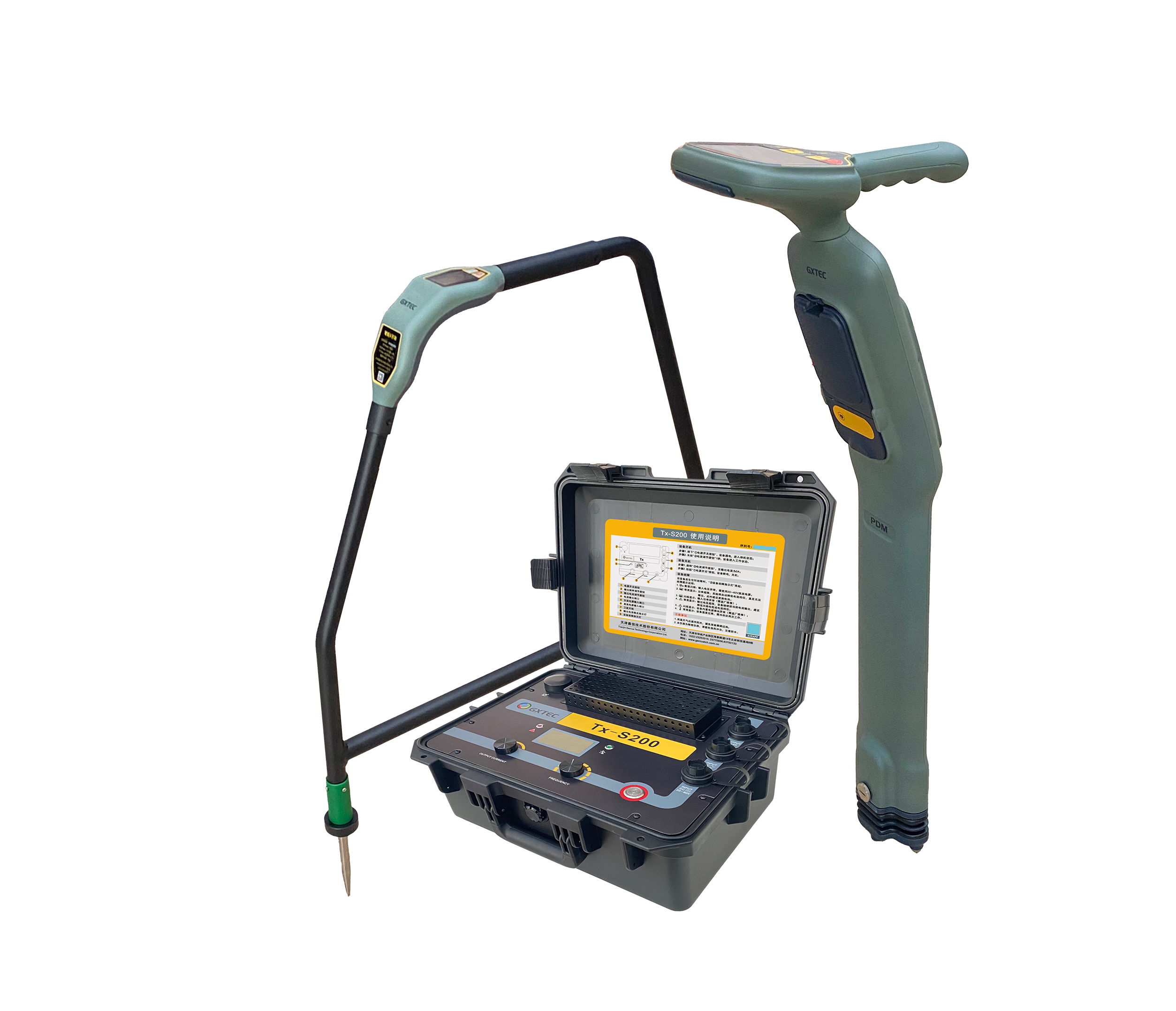 本次檢測使用了嘉信技術新研發(fā)的防腐層檢測儀PDM,我們使用了2臺標配衛(wèi)星同步功能的200W大功率發(fā)射機,一臺接收機和1臺A字架;使用2臺發(fā)射機同步施加信號,可以有效增加待測管道上的信號強度。下圖為PDM接收機、智能A字架和2臺發(fā)射機的圖片。